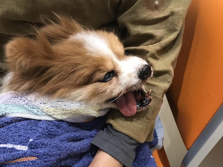 今回は13歳のパピヨンのピーチが、血で顔やカラダが真っ赤になってしまった時のお話です。