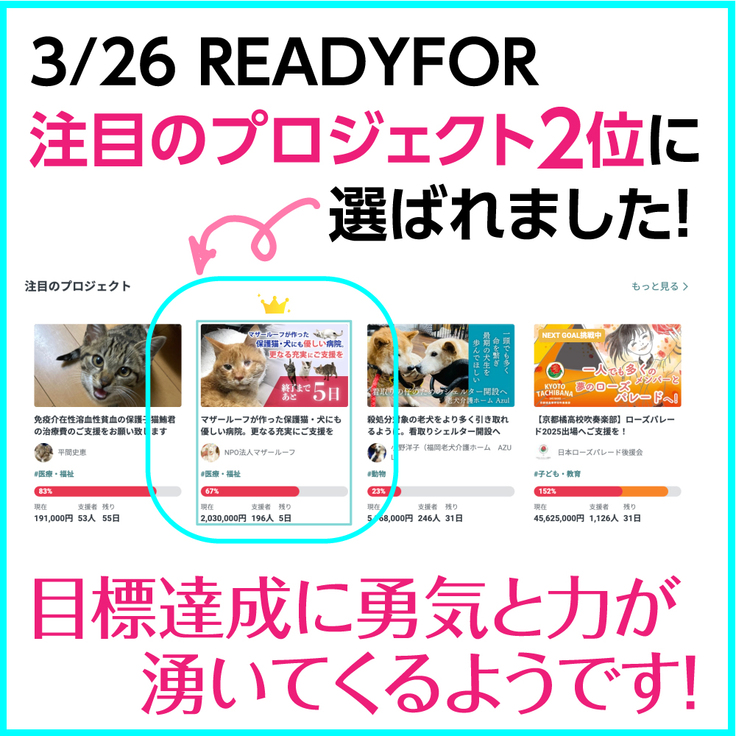 「注目のプロジェクト2位に選ばれました!」あと5日!目標達成まであと77万7千円