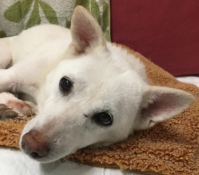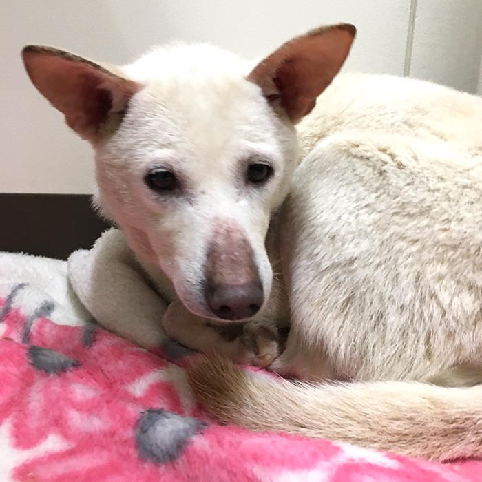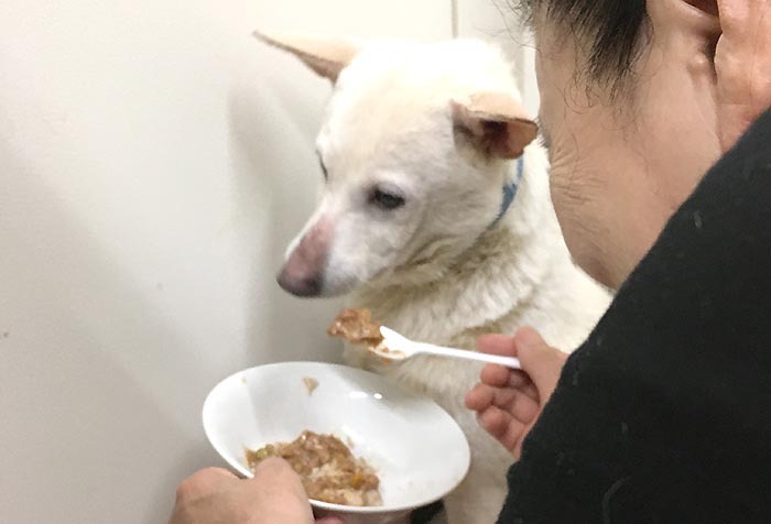 山の中で飼育され、多頭飼育崩壊になっているところから白い雌犬を引き取り、