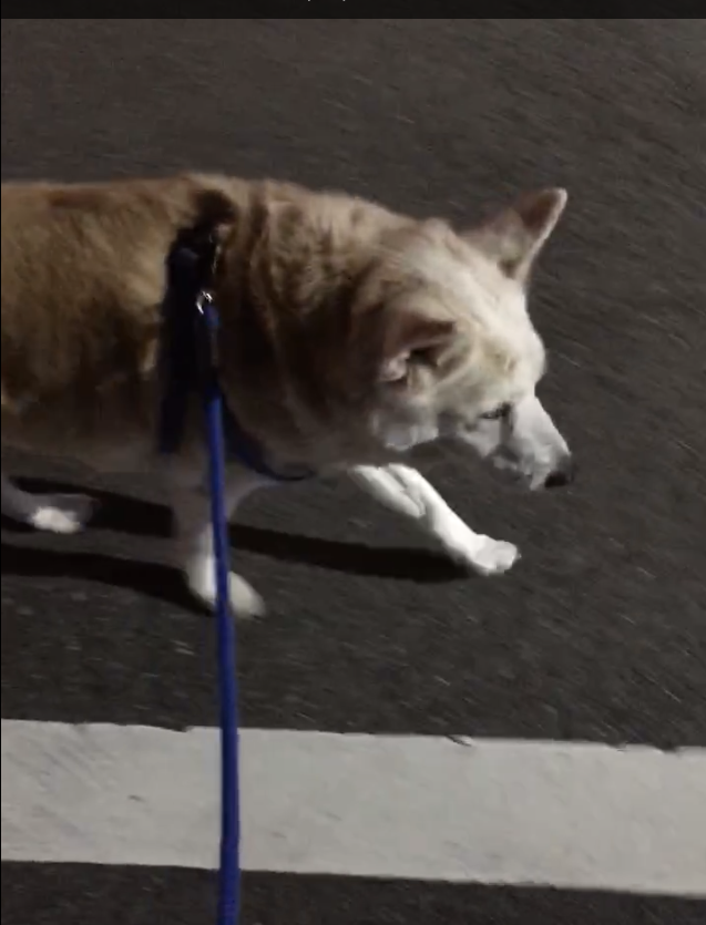 マザールーフでは犬達を毎日、散歩と別に夜の排泄にいくのですが、中型犬(大きめです)の男の子で15歳のホワイトをスタッフが連れて行っていました。