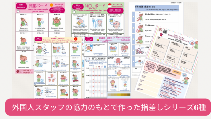 私たちがこの3年間で開発・作成してきた外国人ママのための指差しシリーズは6種類あります。(各10−12言語に対応)シリーズは外国人スタッフや助産師メンバーが意見を出し合って開発しました。