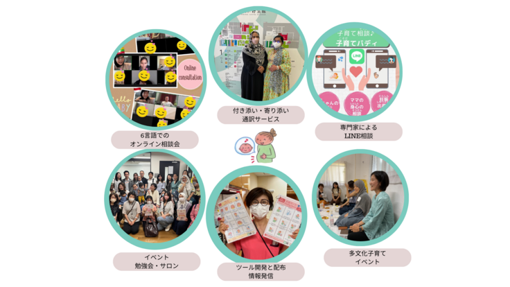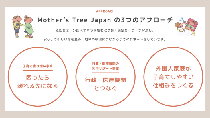 そんな現状を踏まえ、外国人メンバーの声を聞きながら私たちは下記の3つのアプローチ、6つを主な活動で日々外国人ママたちに寄り添っています。