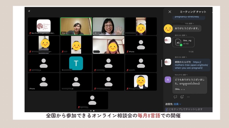 毎月のオンライン相談会は体調が今ひとつだったり、臨月に入っていても気楽に参加できることから全国の妊婦さん・お母さんたちが参加します。自分の国の言葉で思い切り話せることもとても大切な時間です。