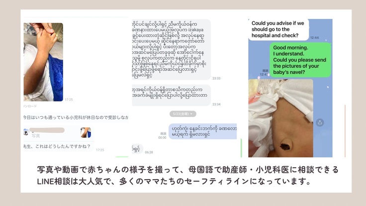 写真や動画で赤ちゃんや自分の体調を細かく伝えることができるLINE相談はとても人気です。通訳メンバーと小児科医・助産師・保育士で丁寧にサポートしています。陣痛時などは、外国人スタッフが昼夜を問わずサポートしてくれて、新しい命の誕生を支えています。