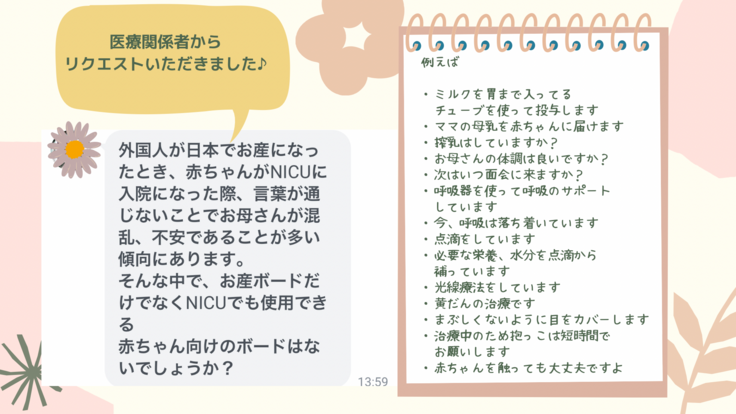 そして、今年度は医療関係者、外国人ママ双方のリクエストである「指差しNICUボード」「指差し小児科ボード」「指差し陣痛カード」を製作する予定です。