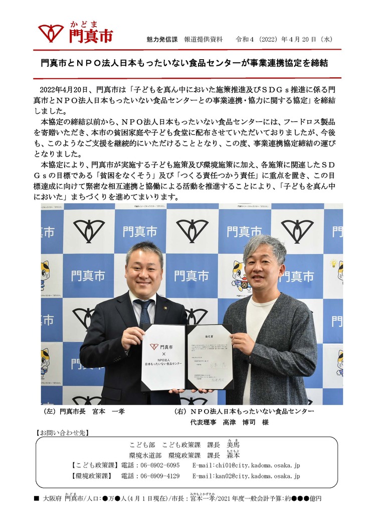 2022年4月20日、当団体は大阪府門真市と「子どもを真ん中においた施策推進及びSDGs推進に関わる門真市とNPO法人日本もったいない食品センターとの事業連携・協力に関する協定」を締結いたしました。