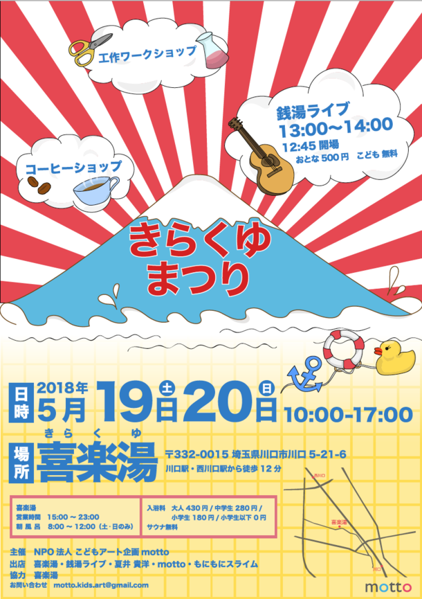 埼玉県川口市の銭湯で、mottoが初めて主催するイベントです。工作のワークショップ、コーヒーショップ、銭湯ライブもあり盛りだくさん!みなさまお誘い合わせの上、ぜひ遊びに来てください!