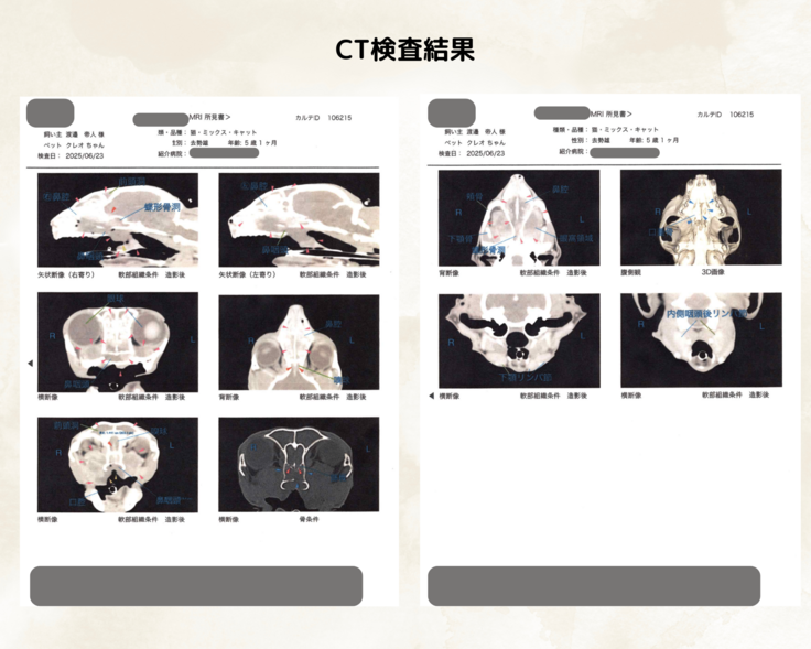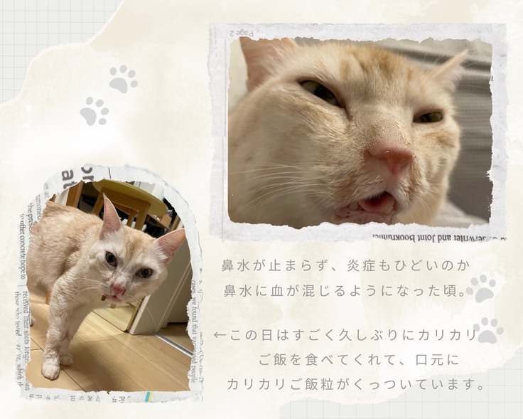 鼻腔内の腫瘍であることと、口内の上顎にできた潰瘍の成長が進み、匂いを感じられず痛みもありご飯が食べられない状態です。