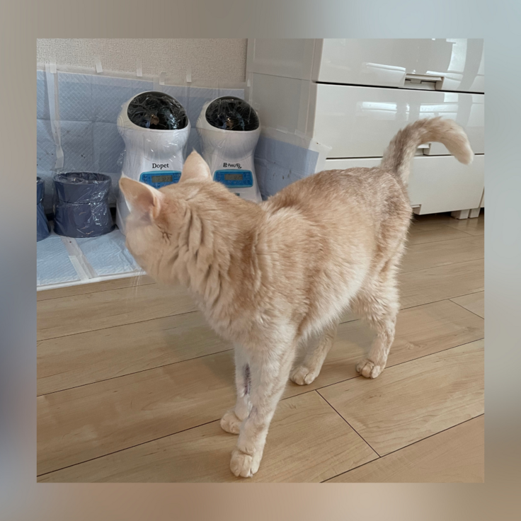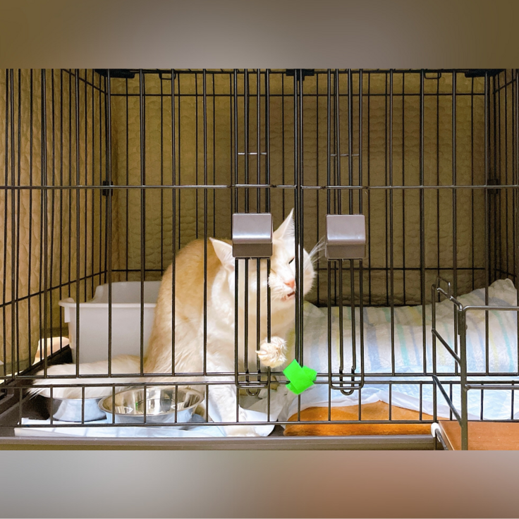 お昼過ぎまで様子見のためゲージで過ごしました。全くご飯を食べないので「副作用で辛いのかな…💦」っと心配しましたが、外に出したらめちゃくちゃご飯を食べてお気に入りのおもちゃで遊んでいました。(不貞腐れてただけでした(笑))