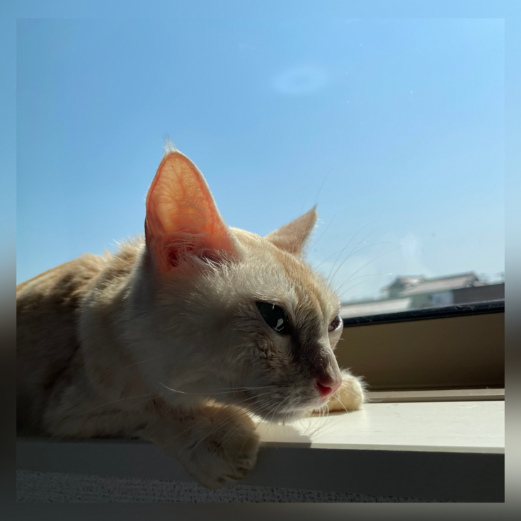 窓際へと歩いていったので、日向ぼっこがしたいのかな?と思い、抱っこで窓辺に連れていくと、ゴロゴロとのどを鳴らしながら、とても気持ちよさそうな表情を見せてくれました☀️🌈