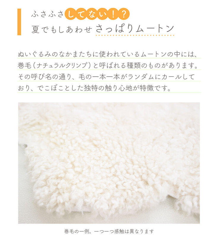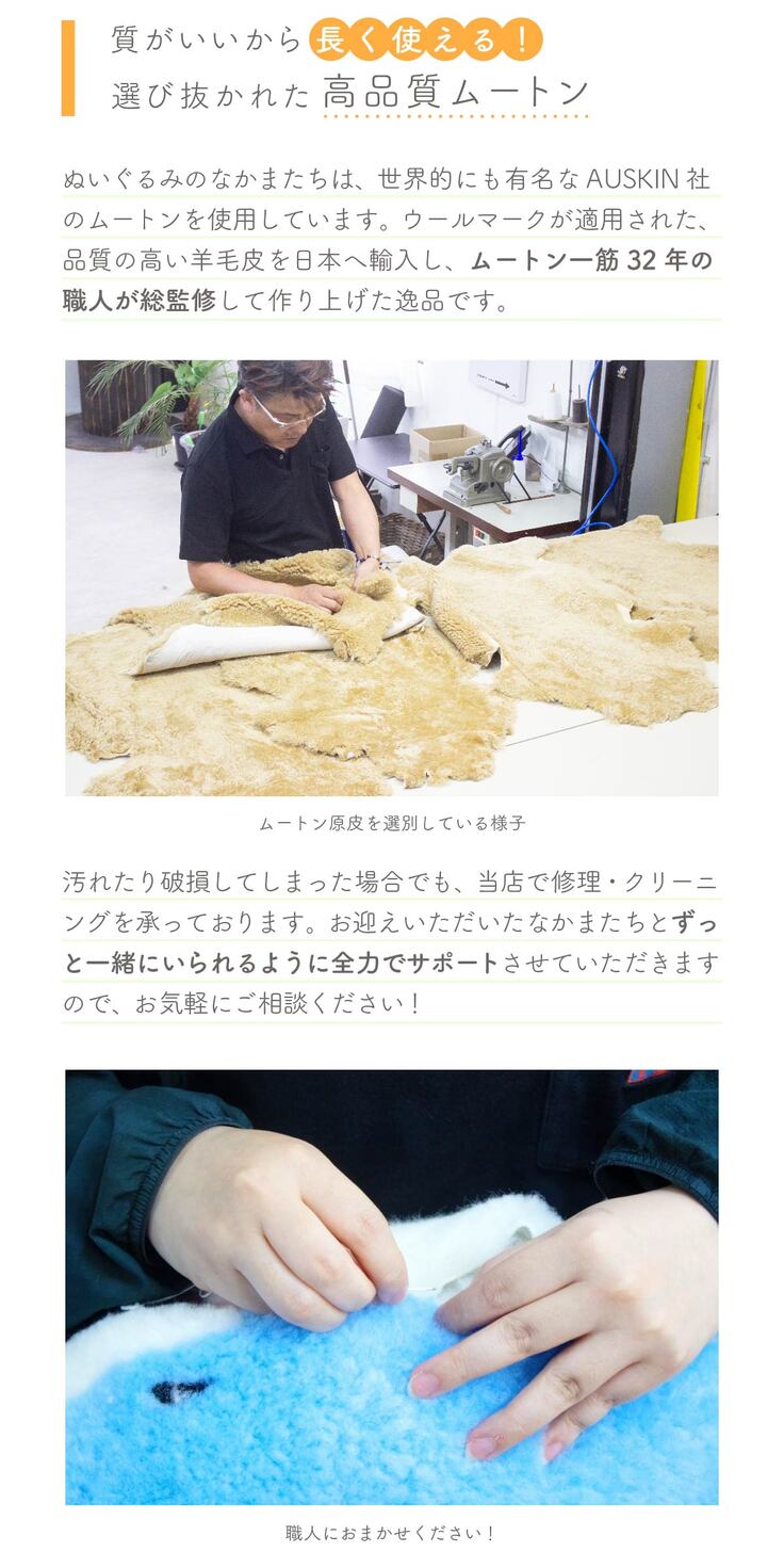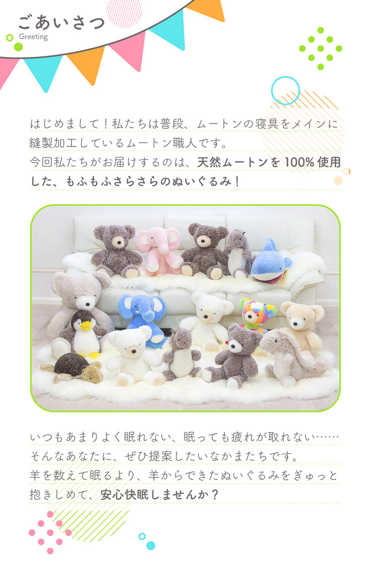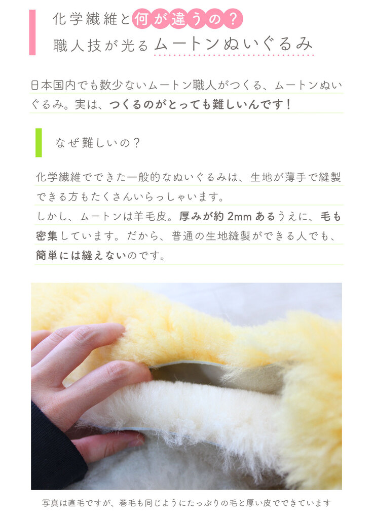 ムートン一筋33年、ムートン専門の縫製加工として運営してきました。 最初はクッション1枚縫製するのに半日かかりました。 今ではクッション・ラグ・バッグ・寝具から介護用品まで多様種にわたり縫製加工しています。 永年の経験で睡眠とかかわることでこれまでにないムートン商品を検討していたら、赤ちゃんが眠っている横にぬいぐるみがあるのを見て、快適睡眠にはムートンぬいぐるみを作ることに目覚めました。