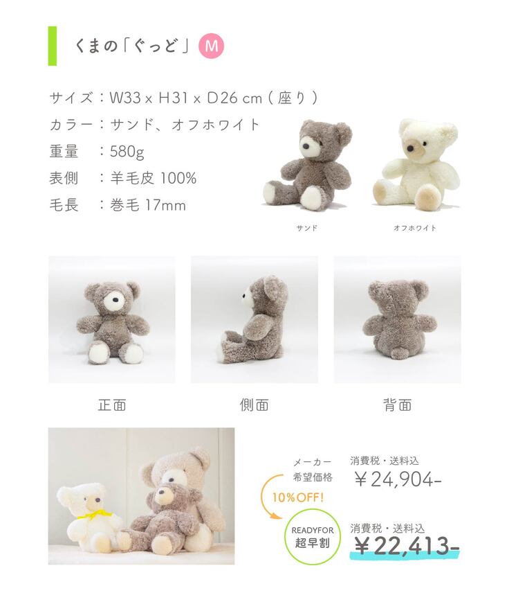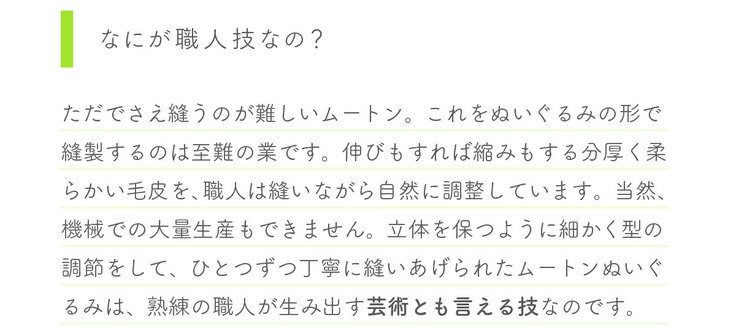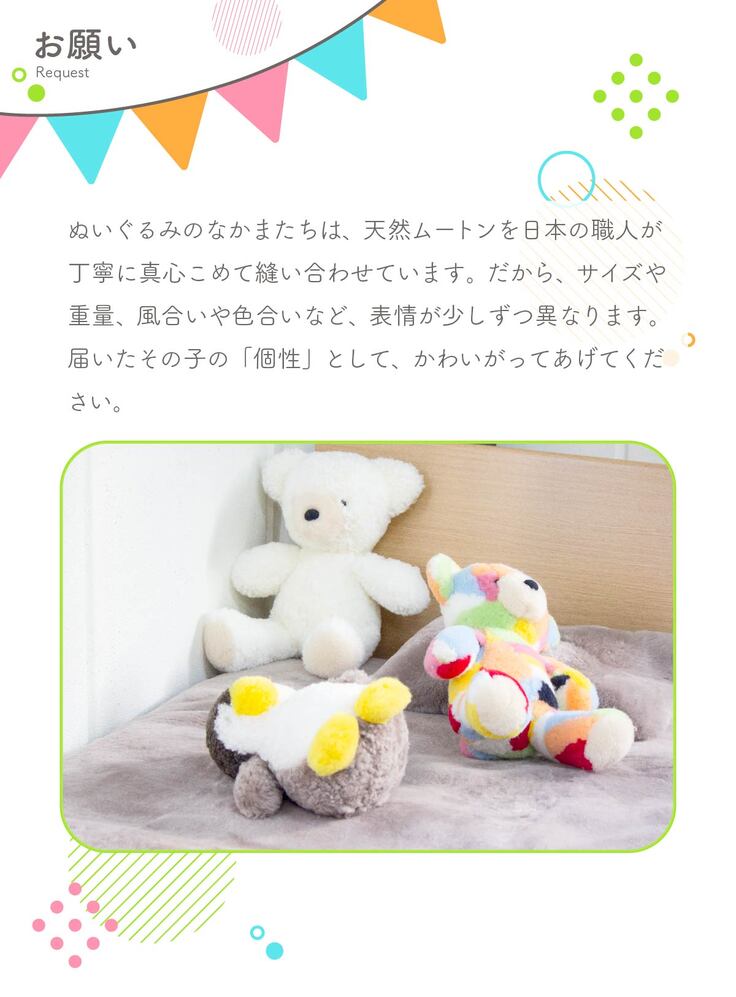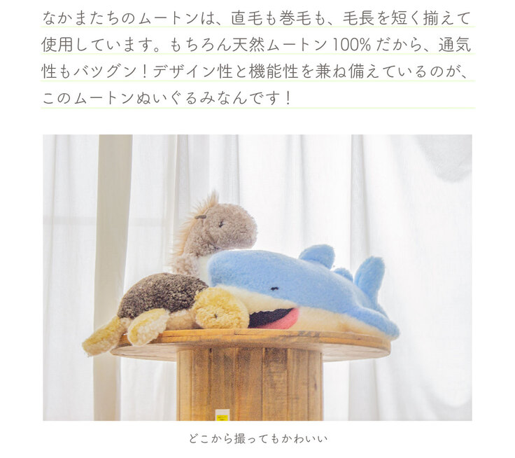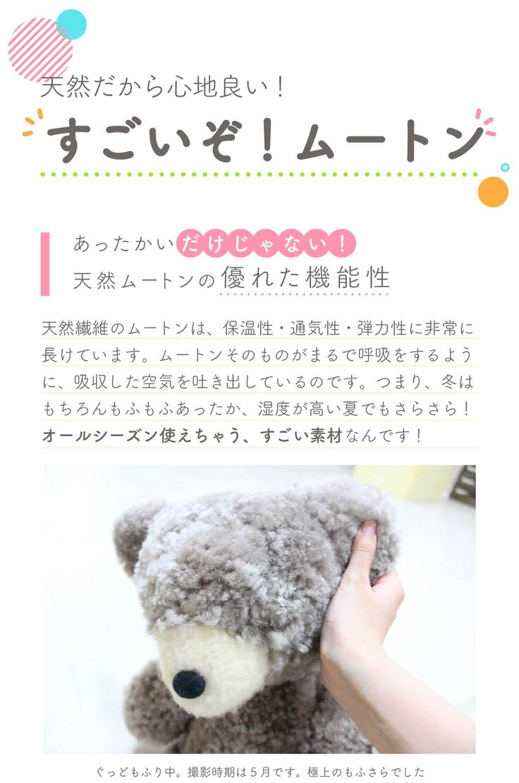 ムートン一筋33年、ムートン専門の縫製加工として運営してきました。 最初はクッション1枚縫製するのに半日かかりました。 今ではクッション・ラグ・バッグ・寝具から介護用品まで多様種にわたり縫製加工しています。 永年の経験で睡眠とかかわることでこれまでにないムートン商品を検討していたら、赤ちゃんが眠っている横にぬいぐるみがあるのを見て、快適睡眠にはムートンぬいぐるみを作ることに目覚めました。