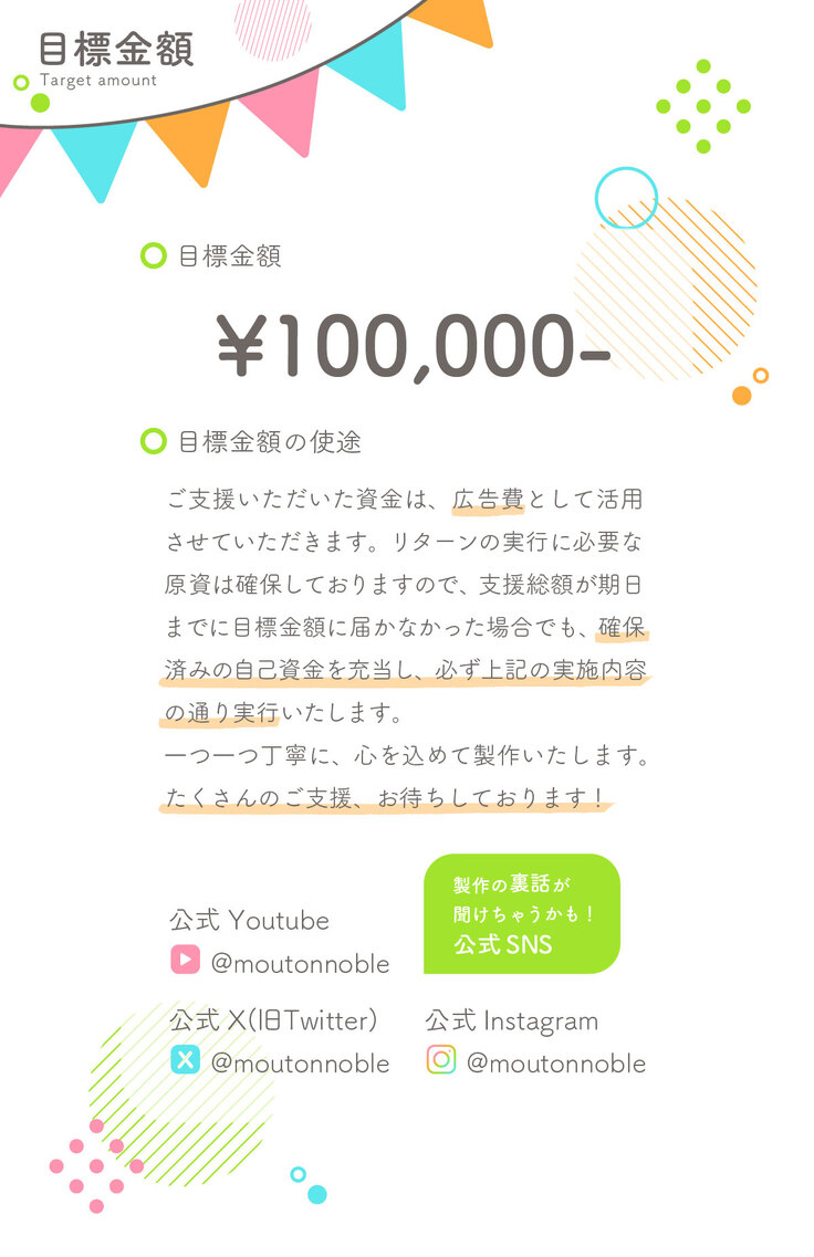 リターンを製作し支援者様にお届けします。集まった資金は広告費として使用します。※想定以上のご支援をいただけた場合は、新たな製品の開発費に充てさせていただきます。