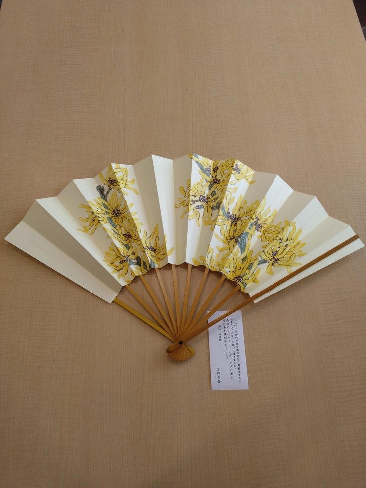 こちらは、野村万作の古稀を記念して、20年前に作成した”まんさくの花”の狂言扇です。原画は、万作の会で長きに渡り、小道具や装束を制作していた、亡き野村良乍の筆によるもの。優しいふくよかな図柄に良乍氏の笑顔を思い出しました。