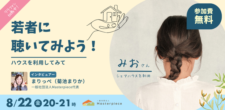 Masterpieceが運営するハウスを利用したことがあり、現在はハウスから卒業している「みおさん」より、お話をお伺いします。代表菊池とみおさんの対談イベントです。