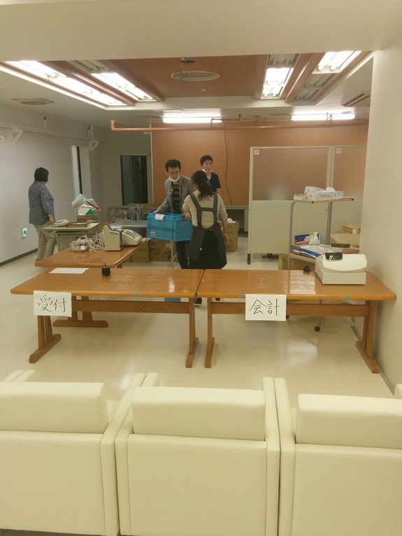 職員のアイデアで一時的に対処しているお会計・受付エリア、被害の少なかったフロアから集めてきた椅子など、表向きにもまだまだではありますが、1か月ぶりにみるきれいな床に、気持ちも明るくなります!