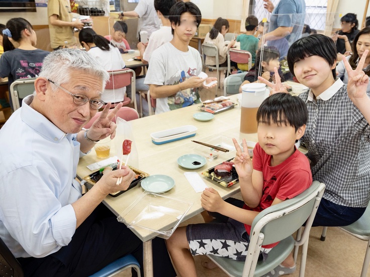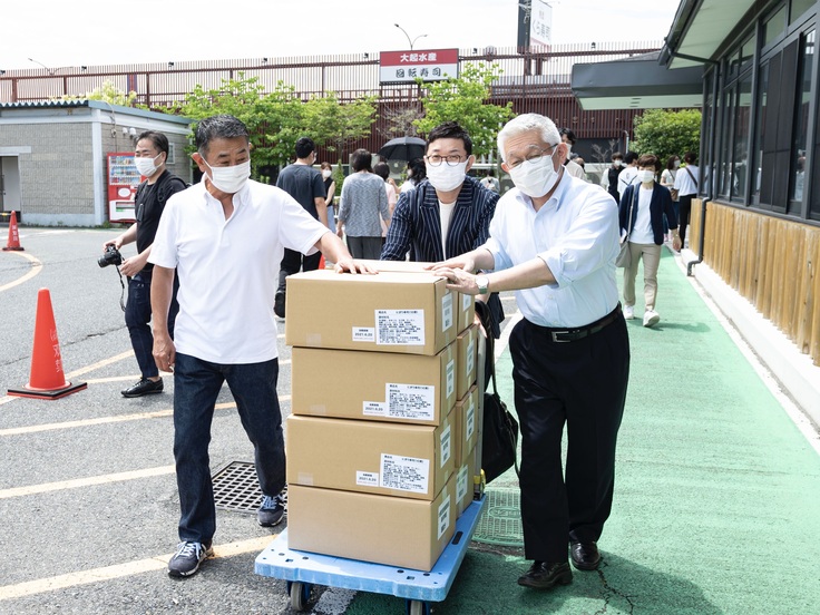 そこで受賞者OBでもある回転寿司チェーン店「大起水産」の佐伯会長に、お寿司の提供をご相談し、結果快諾いただくき、その年から3年間、父の日に受賞者OBや弊会会員の皆様と共に、私たちが施設に出向き、お寿司などを “届ける” という形でコロナに負けず、継続出来たのでした。