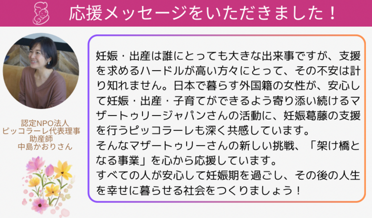 妊娠・出産は誰にとっても大きな出来事ですが、支援を求めるハードルが高い方々にとって、その不安は計り知れません。日本で暮らす外国籍の女性が、安心して妊娠・出産・子育てができるよう寄り添い続けるマザートゥリージャパンさんの活動に、妊娠葛藤の支援を行うピッコラーレも深く共感しています。
