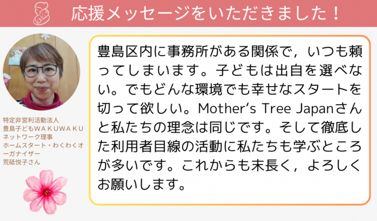 本日は、NPO法人Mother‘s Tree Japanを設立してすぐに、ご連絡をくださり会いに来て下さったホームスタートわくわくの荒砥さんから頂いた応援メッセージを紹介させてください。