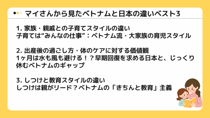 マイさんからは、ベトナムでは「産後は風にも当たってはいけないし、水も使ってはいけない」という産後の風習の話があるため、日本で「赤ちゃんにミルクをあげる前に手を洗ってください」「2週間後に健診があります」と言われたときはとても驚いた、というエピソードも紹介され、「そうか!手洗いも水だ!」と気付かされました。