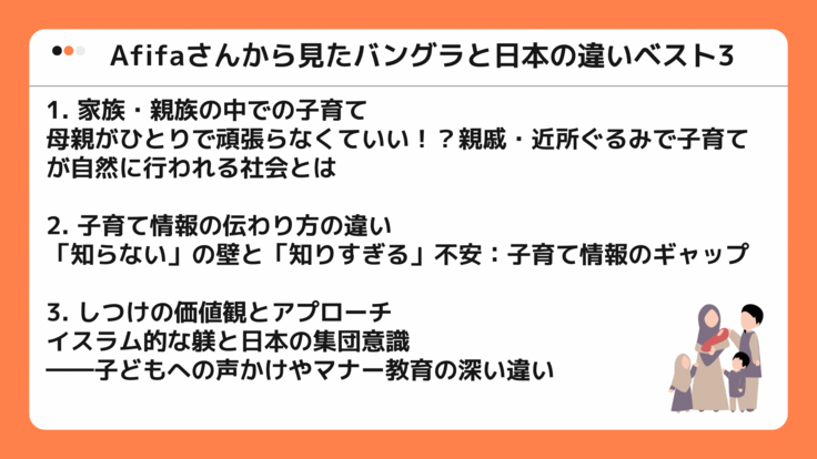 特に印象に残ったのは、Afifaさんの「バングラデシュには“平均”という考え方があまりない。みんなが個性的すぎるから(笑)」という言葉。