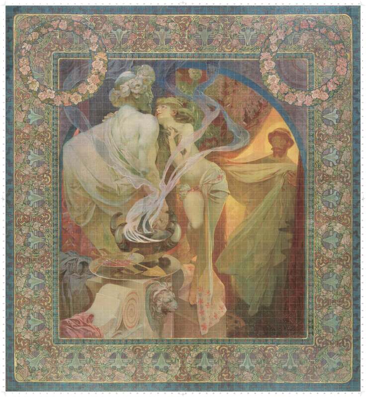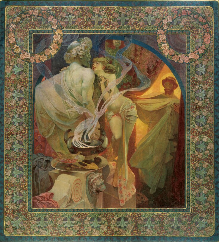 ポーランドのノーベル賞作家・ヘンリク・シェンキェヴィチの同名小説を主題とした縦横2メートルをこえる大型油彩画。キリスト教徒の迫害と信仰がテーマの物語のなかで、ミュシャは脇役の恋模様を題材としました。暴君ネロ統治下の古代ローマの貴族邸宅の一室を舞台に、奴隷として雇われた少女エウニケが思いを寄せる主人ペトロニウスをかたどった大理石像に口づけるシーンが描かれています。背後から見つめる男性の描写は原作にないため、ミュシャが独自に書き加えたシーンと考えられ、その解釈には諸説あります。