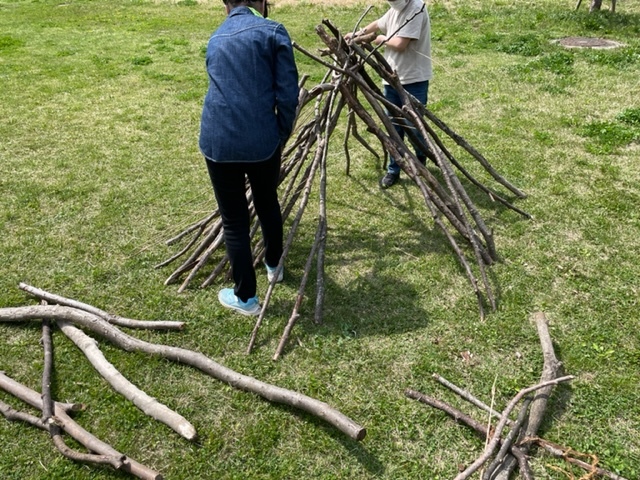 スクールそばの大きな森公園では、自然体験が遊びと学びに繋がっています。この日は、1時間夢中になって木の枝を集め、仲間と協力し合って秘密基地を作っていました。