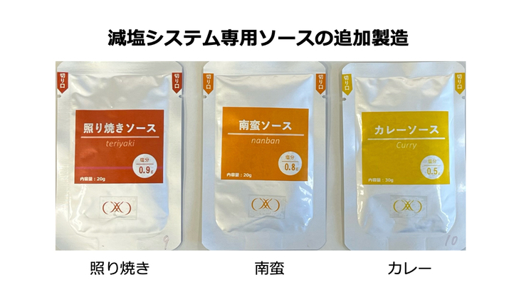 第一目標達成によりまして、3種類の減塩システム専用ソースの追加製造が確実となりました! 現在のところ、「照り焼きソース」「南蛮ソース」「カレーソース」の製造を予定しています。(写真はイメージで多少デザインが変わる可能性があります)
