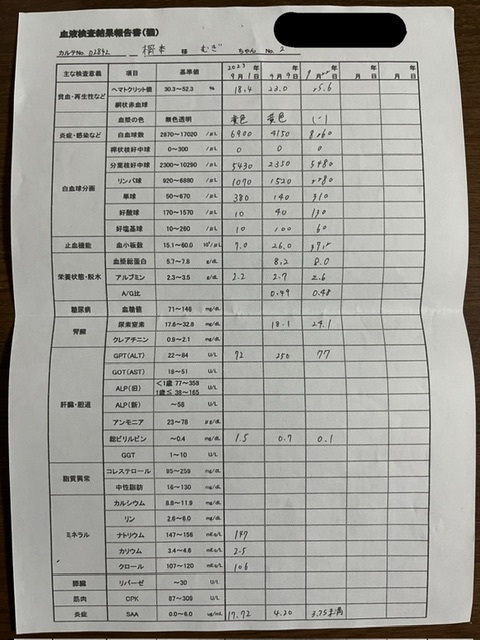 血液検査の結果は、A/G比はあまり変わっていないけど、貧血と炎症反応とビリルビン値は下がっていて、薬の効果が出ているみたい✨