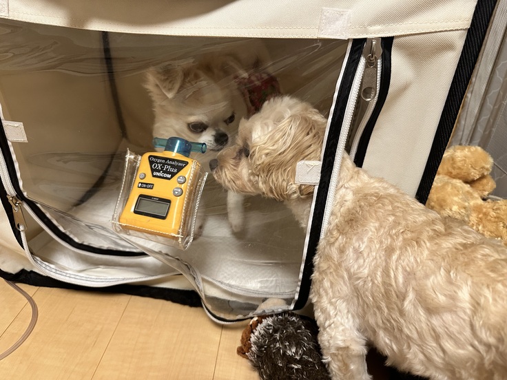 かかりつけの獣医さんからは咳が出た時や呼吸数が多い時、体調が悪そうな時に入れて下さいと言われてますが、体調がいい時も自ら酸素室に入り、電源入れてとアピールしてきます☺️