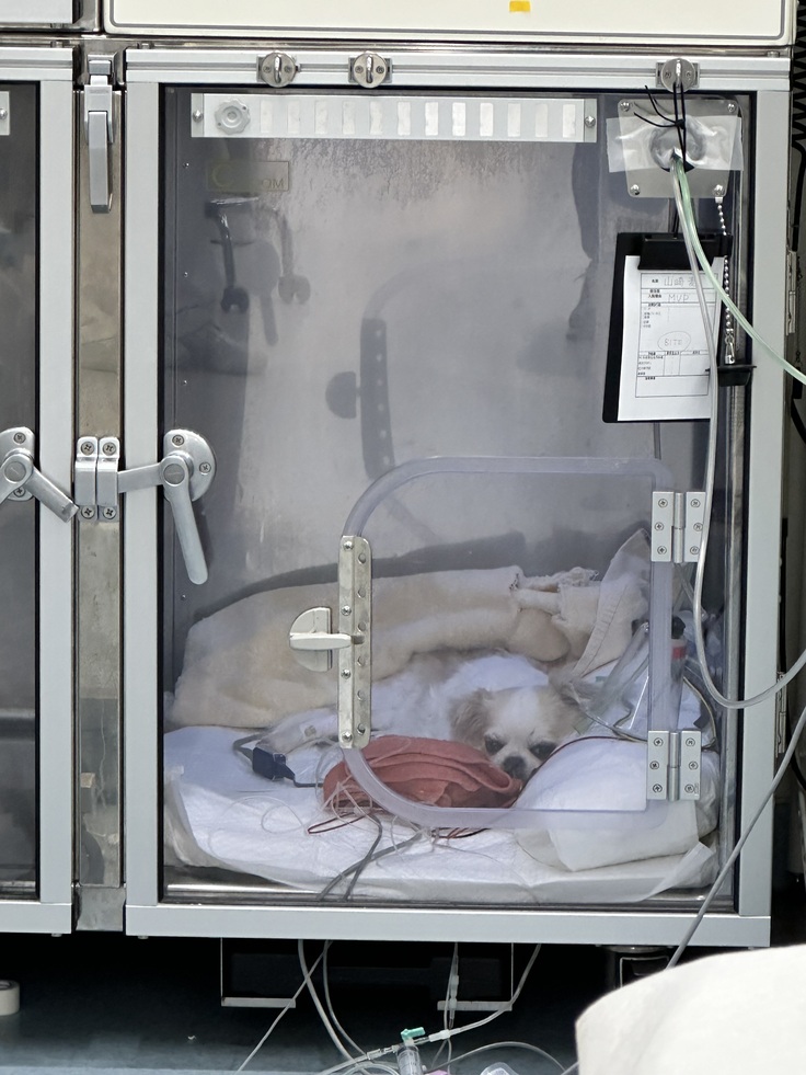お話しの後、オペ室の台の上で眠りながら点滴などの処置を受けてる麦の姿を遠くから見ることが出来ました。