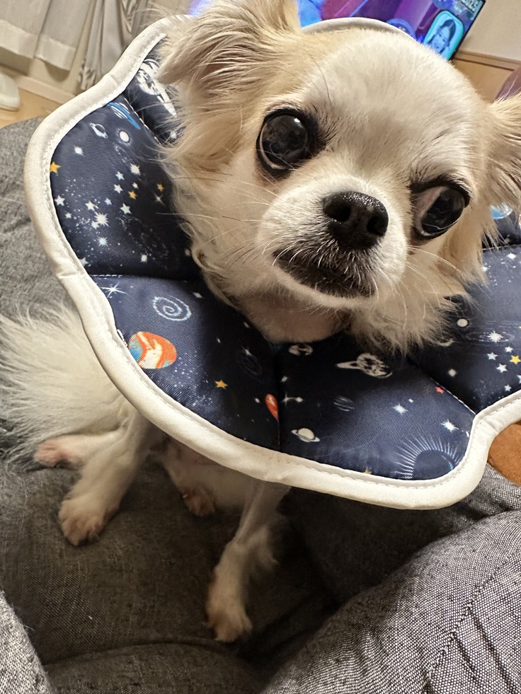お家に戻って来て、エリザベスカラーがなれず不満そうな麦😅