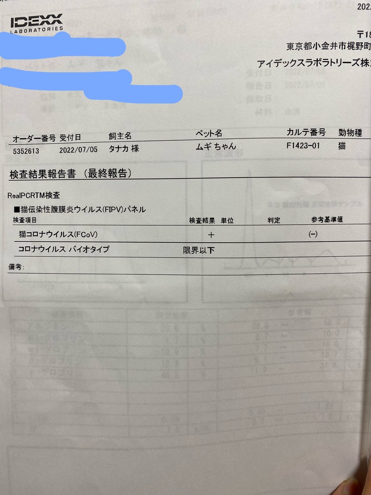 腹水から血清を採取し外注の確定検査後、FIP陽性確定。