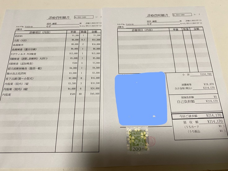 しかしFIPの治療は保険の利かない未認証の高額なお薬の他に入院費や都度の定期検査代などがかかることもあり、今の私にとってはお恥ずかしながら大変高額で厳しい状況です。