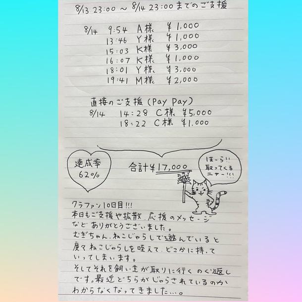 8/13 23:00〜8/14 23:00までにいただいたご支援のお礼