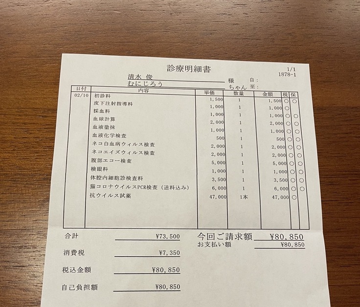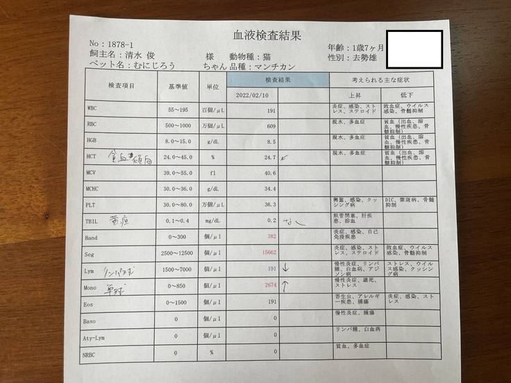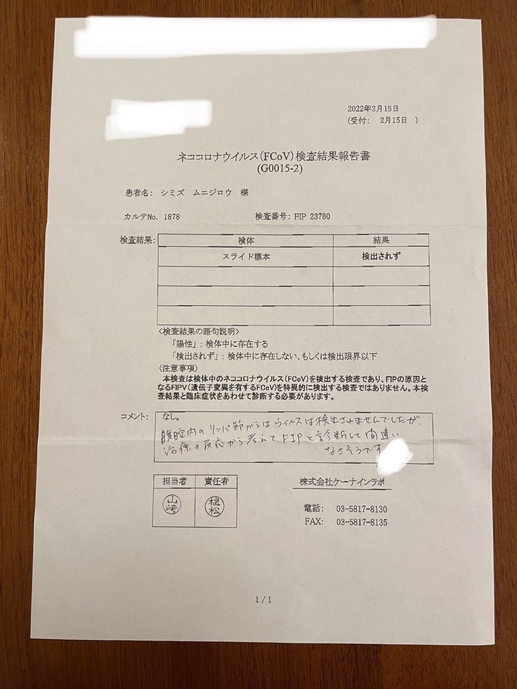 血液検査の結果、猫伝染性腹膜炎FIP(ドライタイプ)の可能性が高いと診断されました。