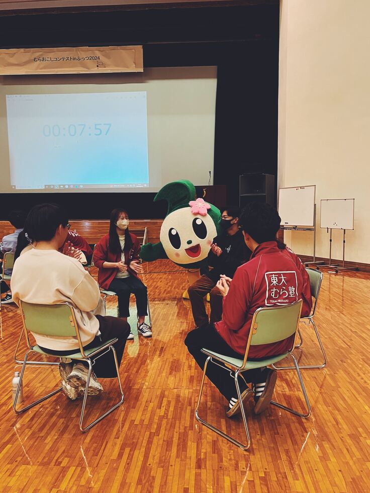 開会式の後、グループに分かれて参加学生・むら塾生間のアイスブレイクを行いました!アイスブレイクでは、富津市おもてなしキャラクター、ふっつんも登場しました!!学年やむら塾生・参加学生の垣根を超えて仲良くなることができました!