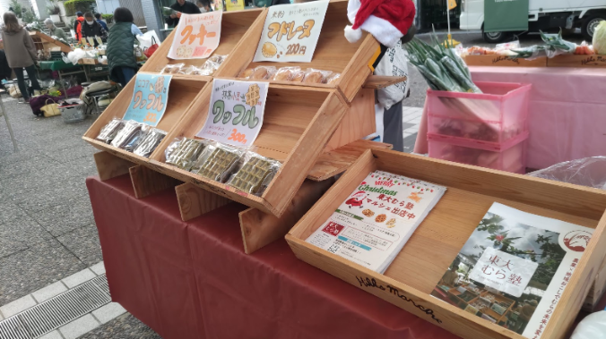 東大で年二回開催されている学園祭では、ブランド米「てとて」を使用したパンケーキやチジミなどを販売しています。同時に地域の方々から出品していただいた野菜の販売もおこなっています。