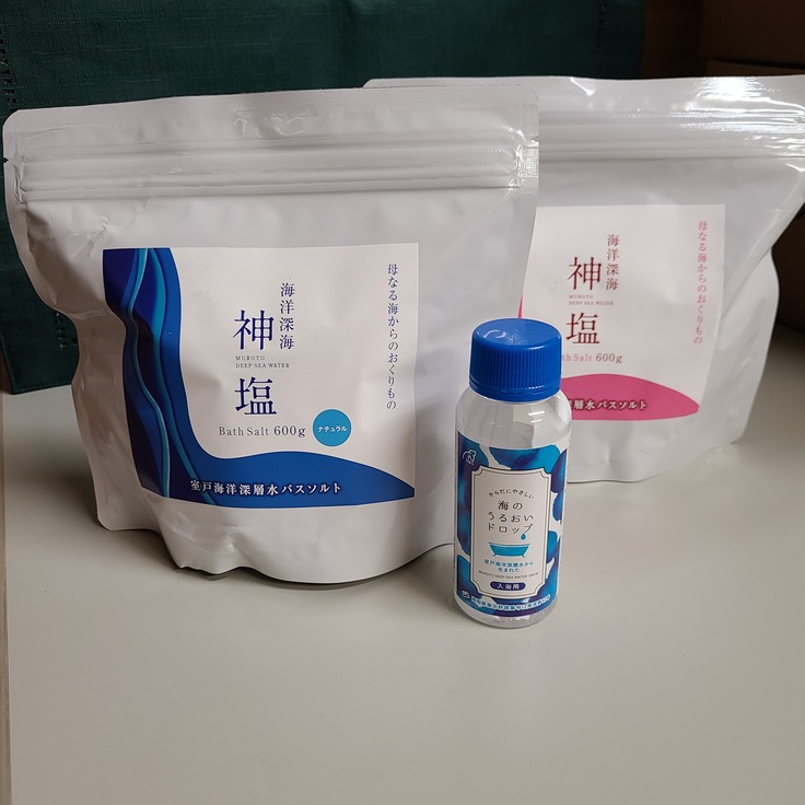 香料・色素他一切の添加物を入れていない海洋深層水塩のみの”ナチュラルタイプ”と、海洋深層水塩にローズマリー系の香りと乳白色の色素を加えた”リラックスタイプ”の2種類のバスソルトに、入浴液「海のうるおいドロップ」もお付けしています。