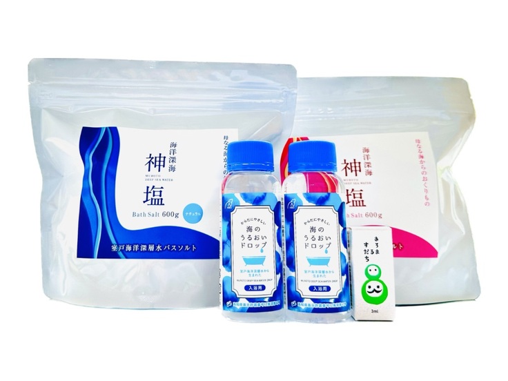 今回ご支援いただいた方には、弊社で製造している海洋深層水塩・にがりと、新しく販売が始まりましたバスソルトなど、様々な海洋深層水商品のリターン品をご用意いたしました。聞~~
