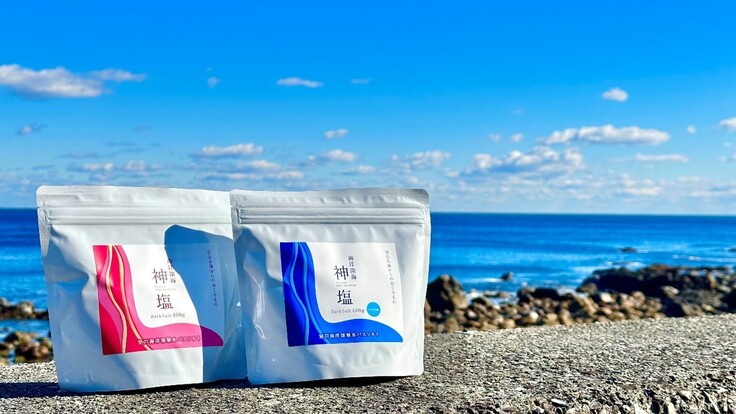 香料・色素他一切の添加物を入れていない海洋深層水塩のみの”ナチュラルタイプ”と、海洋深層水塩にローズマリー系の香りと乳白色の色素を加えた”リラックスタイプ”の2種類のバスソルトに、入浴液「海のうるおいドロップ」もお付けしています。