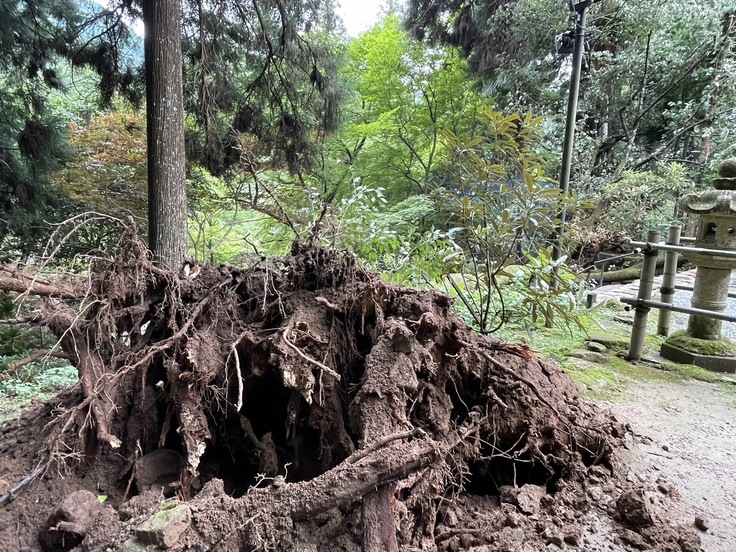 ここ数日の大雨が影響し、鎧坂上の桜が倒木してしまいました。古木ではありますが大木の山桜で、地盤が緩んで木の重さに根っこが耐えられず倒れたと思われます。ご支援金の用途として雨水の排水をあげておりましたが、対策前に被害が出てしまいました。夜間に倒木したため人的被害がなかったのは不幸中の幸いであります。しかし新たに設置した手摺に直撃しましたので、修理が必要となります。