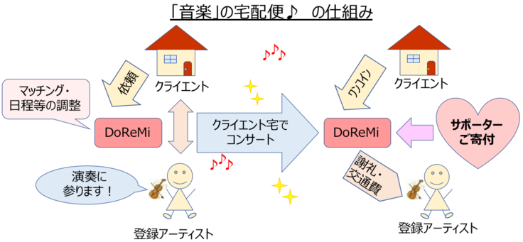 「音楽」の宅配便♪事業は、活動の趣旨にご賛同いただいた企業・法人・個人の皆様からのご支援・ご寄付によって運営されています。クライエント様からのご依頼料はワンコイン(500円)です。また、国内外で活動され「音楽」の宅配便♪事業に賛同して参加してくださっている"登録アーティスト"は現在23名。「音楽」の宅配便♪に伴うアーティストへの交通費・謝金は賜りましたご支援金・ご寄付より支払っています。