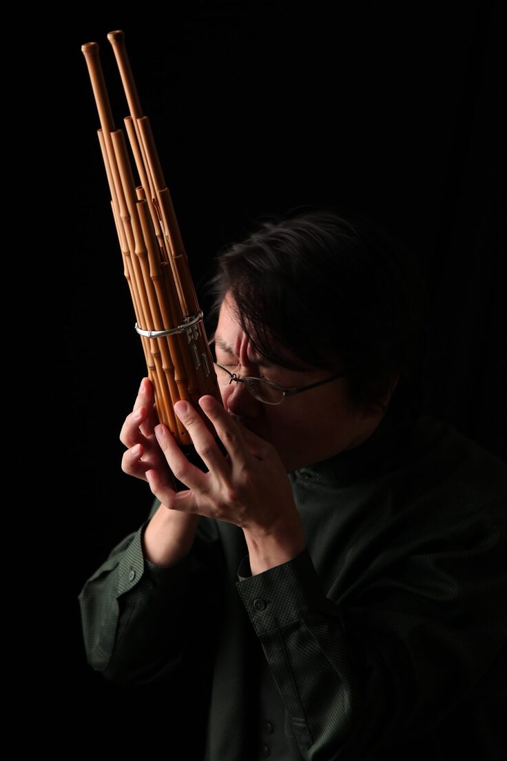 雅楽の笙を演奏し 活動する3人の演奏家。