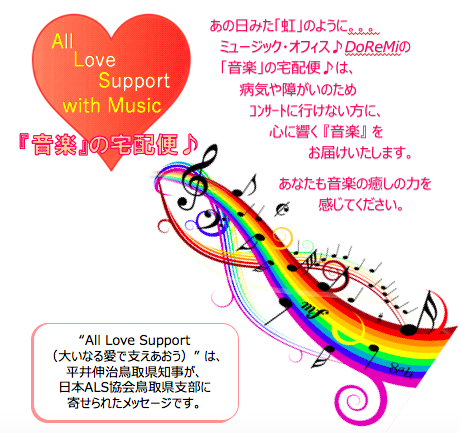 当初、在宅療養されているALSの方に、心に響く「音楽」を届けたいとの思いから活動を始めました。前例もなく手探りの中、2015年11月28日第1回「音楽」の宅配便♪を実施しました。その後、日本ALS協会鳥取県支部に寄せられた、平井伸治鳥取県知事からのメッセージはALSの頭文字から"All Love Support(大いなる愛で支え合おう)"でした。そのメッセージに共感し、"with Music(音楽と共に)"を添えた"All Love Support with Music"は私たちミュージック・オフィス♪DoReMiの理念として、現在も活動を支えるモチベーションとなっています。