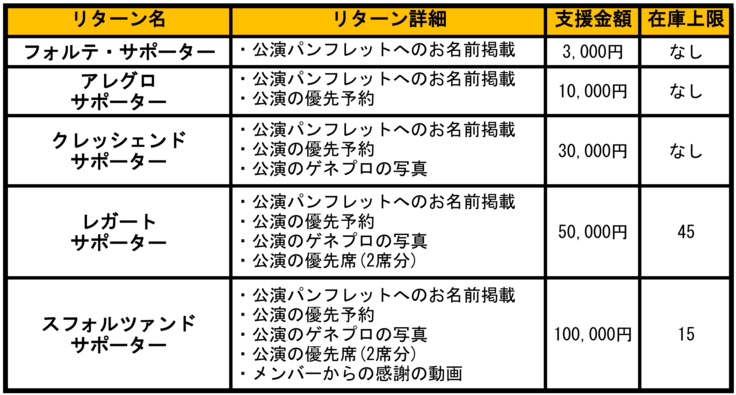 皆様のご支援が直接公演のクオリティ向上につながるため、リターンは心からの感謝を込めた特別な内容にさせていただきました。