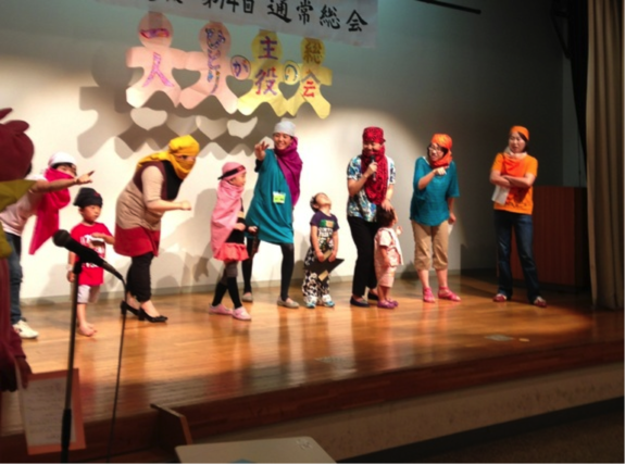 (総会では、親子が一緒に劇仕立てで活動を報告します)