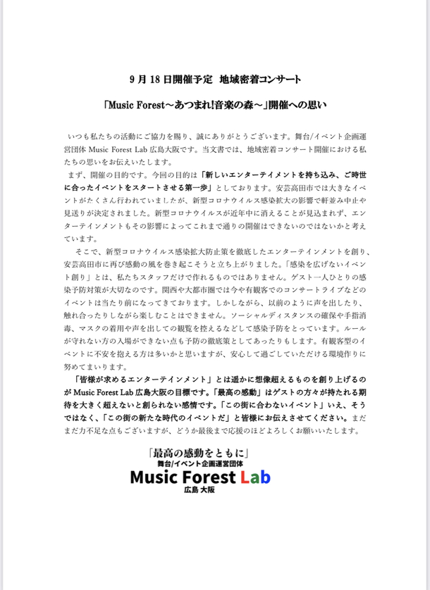 Music Forest Lab広島大阪 より、コンサート開催への思いを公開させて頂きます!