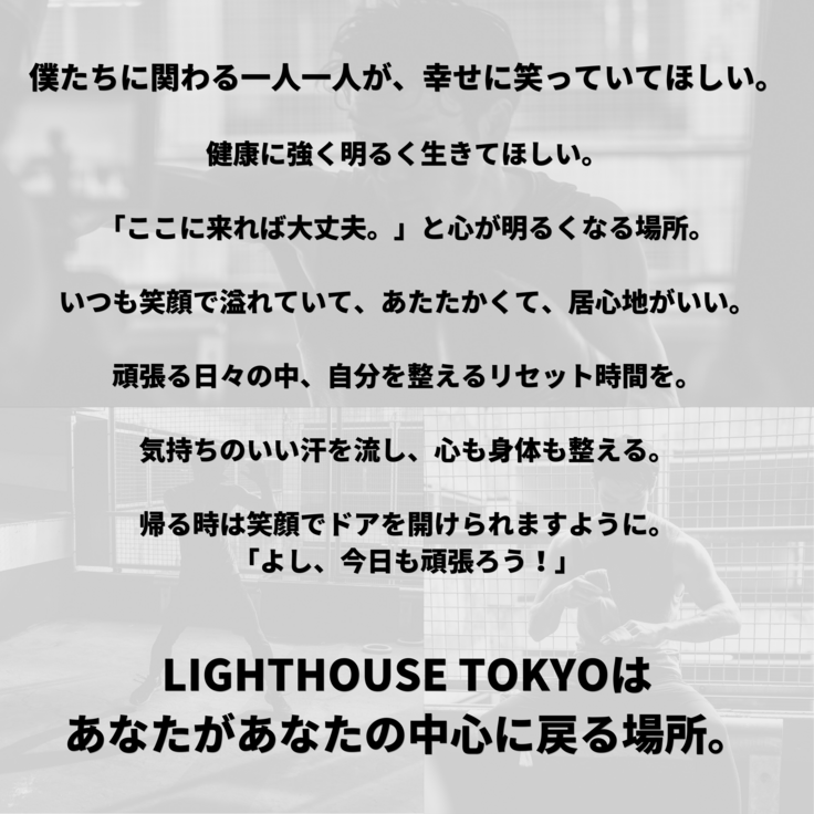 LIGHTHOUSE TOKYOは、ここに来る人たち、トレーナー、関わる全ての人たちを明るく照らし、みんなが輝き、光を放つ場所にします。