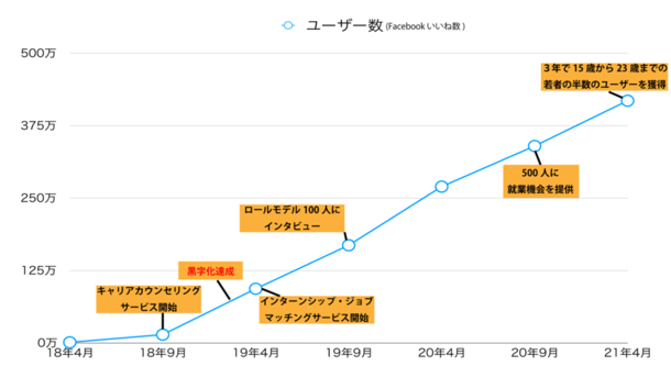 これまで、トップビジネスマンやトップミュージシャンを始めとする15人を超えるロールモデルのビデオを作成しユーザーは1.2万人、平均視聴者数は約1.8万人と着々と歩みを進めてきました。(2018年5月最新データはこちら!)また地方での上映会も行う中で動画を見て涙する若者もいたり、20の高校での約1000人の若者のアンケートでは「感動した」「励まされた」など99%の若者からポジティブな意見を頂きました。キャリア情報をリアルに伝えようと開催したキャリアイベントでは約200名を動員、評価も上々で最大TV局の夕方のニュースにも取り上げて頂きました。